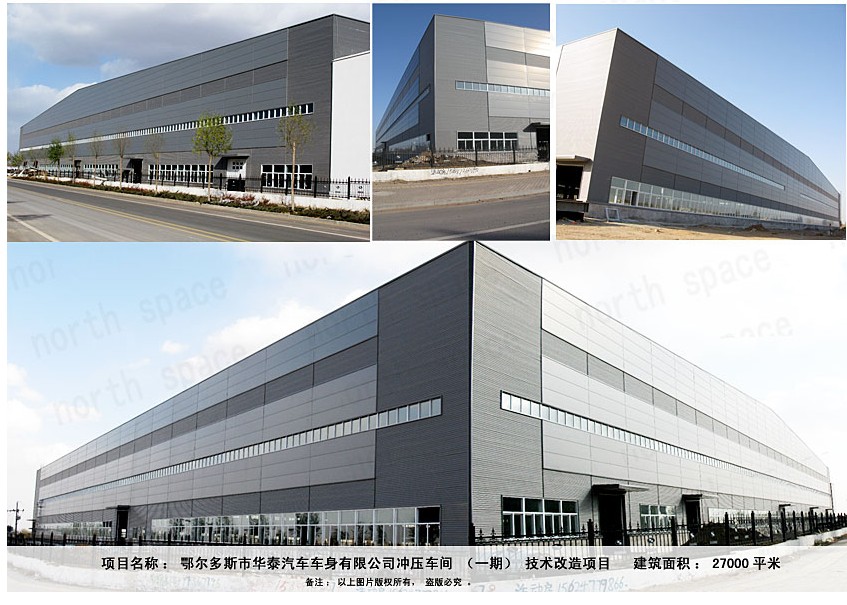 2008年北京北方空间钢结构有限公司凭借强劲的技术实力、施工实力和优质的售后服务体系得到了华泰汽车有限公司的认可,承接其鄂尔多斯华泰汽车车身有限公司冲压车间(一期)技术改造钢结构工程。