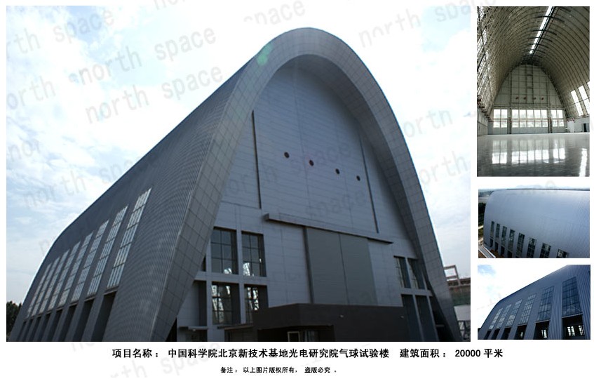 中国科学院北京新技术基地光电研究院,主要从事光电工程以及航空、航天科技领域的技术研究。2010年我公司承建了中国科学院光电研究院气球实验楼项目。此项目位于北京海淀区唐家岭村。总建筑面积为20000平米,楼高44米,外观呈曲线形,南侧设有13米高的大门,主体结构为网架结构。屋面采用北方空间领先国际的NS-BM彩色镀铝锌板系统,墙面外板采用北方空间纯平墙板NS-PW,楼板采用NS-FⅠ楼承板系统。