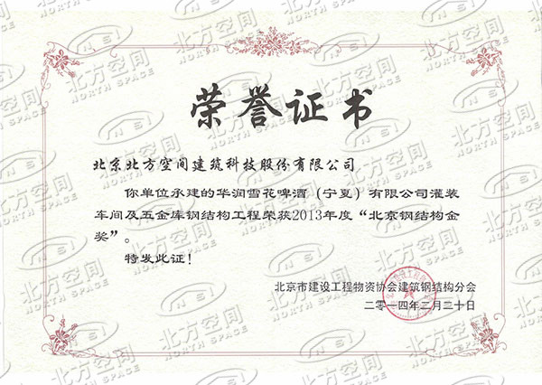 北方空间承建的华润雪花啤酒(宁夏)有限公司灌装车间及金库钢结构工程,荣获2013年度“北京钢结构金奖”