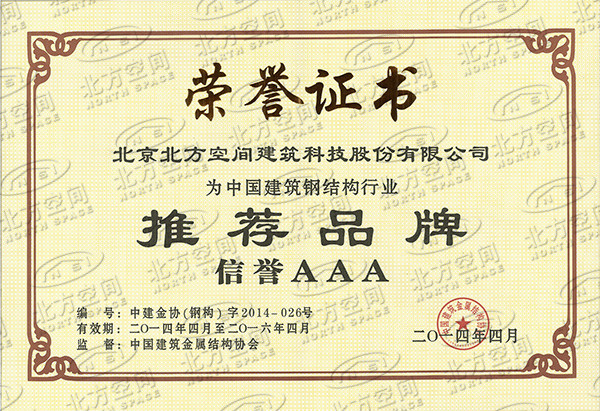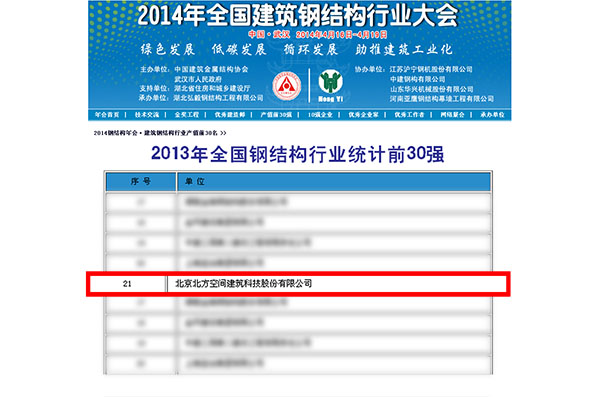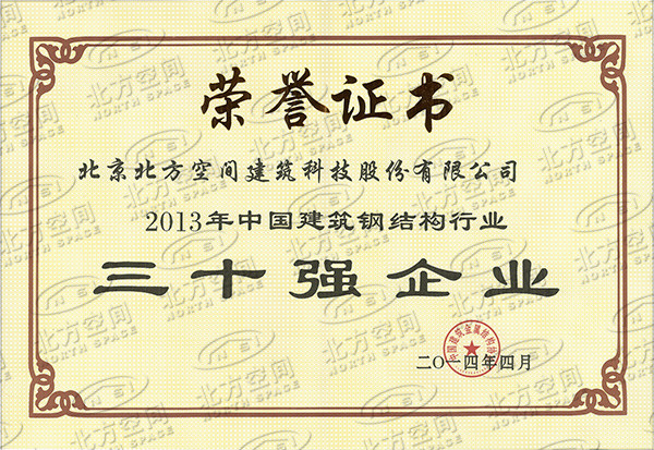 喜报:北方空间荣获“2013年中国建筑钢结构行业三十强企业”和“中国建筑钢结构行业推荐品牌信誉AAA”企业