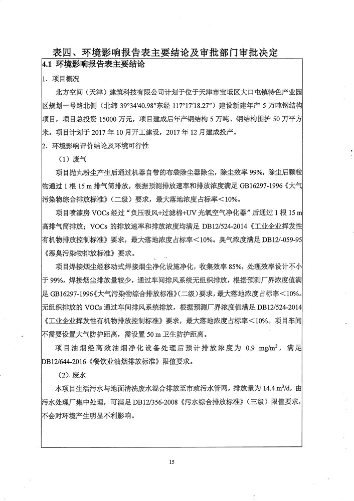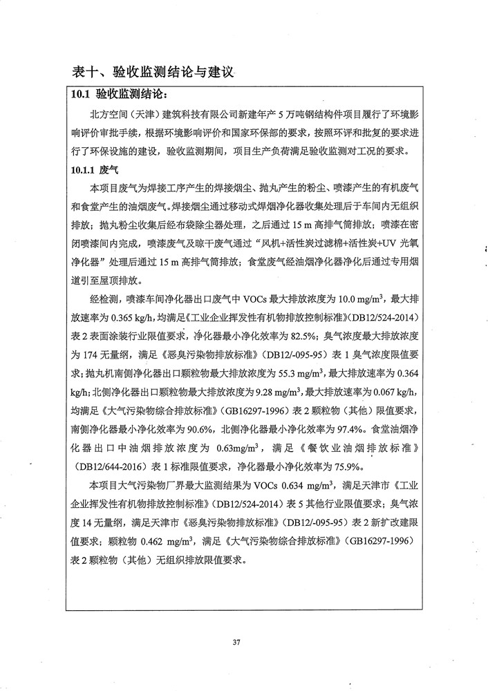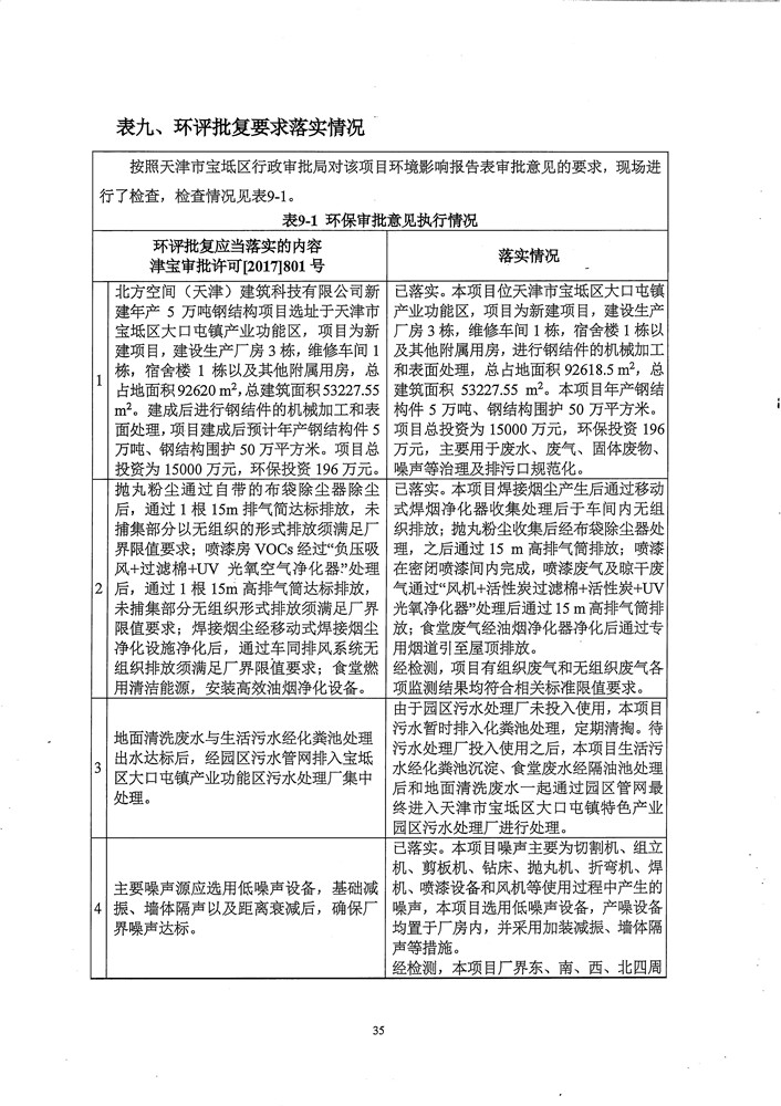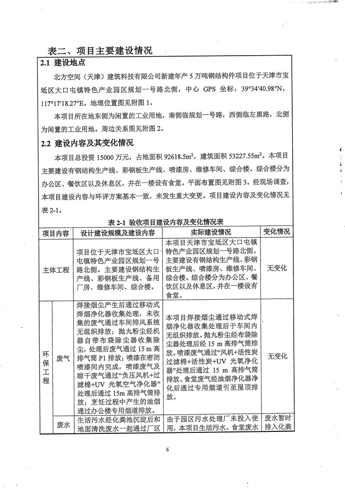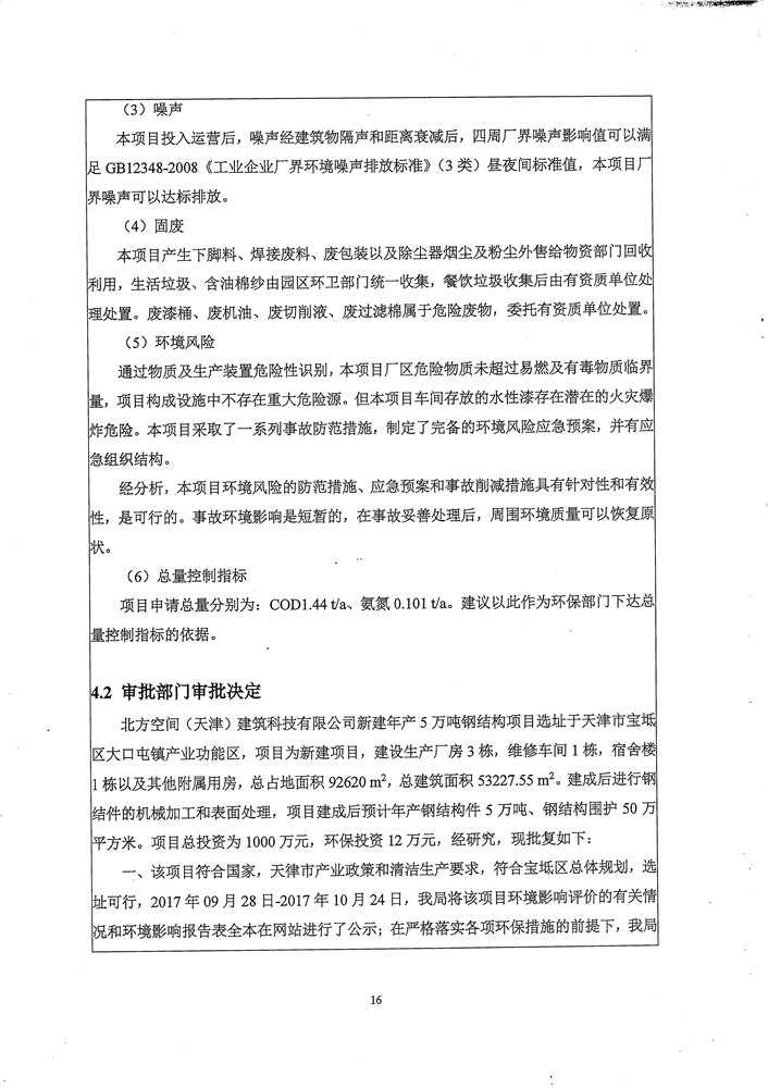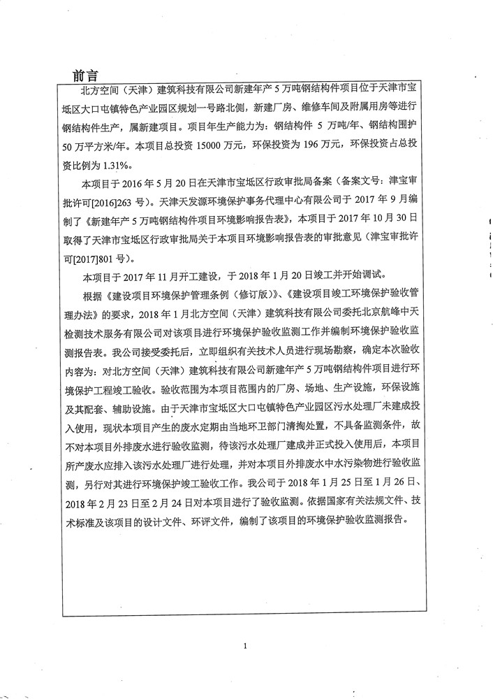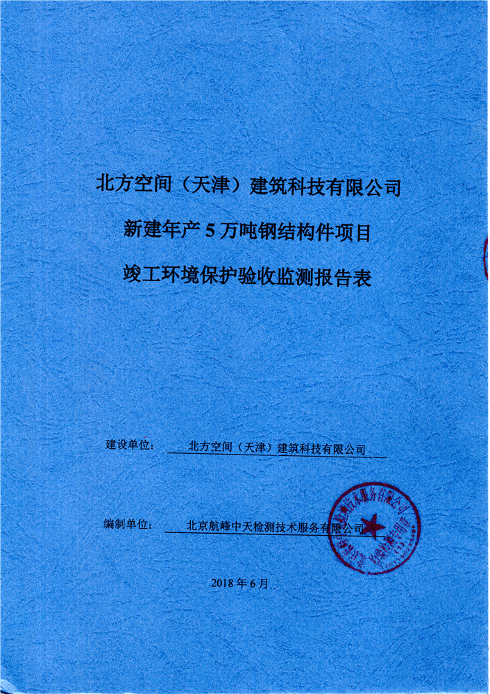 北方空间(天津)建筑科技有限公司新建年产5万吨钢结构件项目竣工环境保护验收监测报告表及环境风险应急预案和事故防范