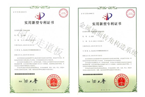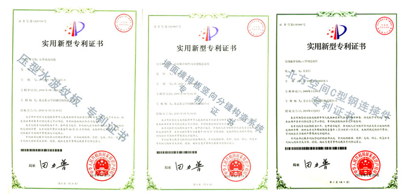 北京北方空间钢结构有限公司——独立研发的新型板材系统获得专利证书。