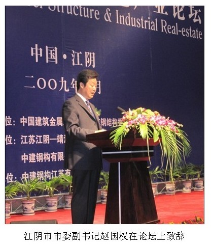 2009年10月20日,《国际钢结构暨工业房地产业论坛》在江阴成功举办,论坛由中国建筑金属结构协会建筑钢结构委员会主办、江苏江阴-靖江工业园区管委会、中建钢构有限公司承办。论坛分析了国际、国内钢结构和工业房地产业的发展形势;探讨了如何完善和提高钢结构、工业房地产的开发设计、施工和管理水平;专家们对如何打造江苏江阴-靖江工业园区成为钢结构制造基地的特色产业献计献策。